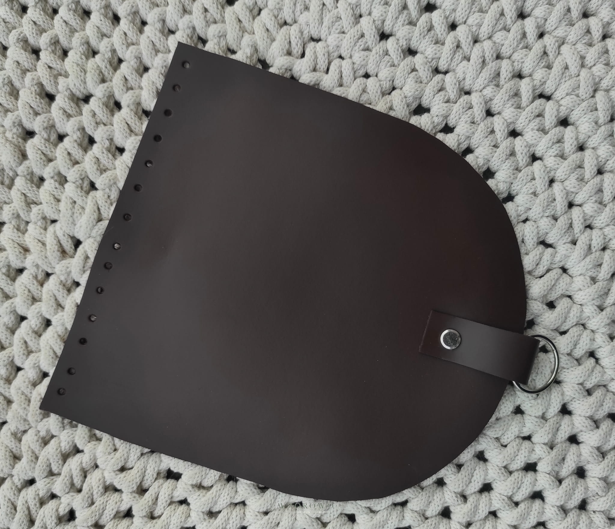 Klapka wycinana ze skóry naturalnej, którą można zamocować szydełkiem do torebki /plecaka ze sznurka.