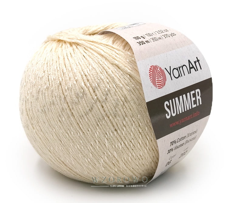 Włóczka Summer to letnia włóczka zawierająca 70% bawełny i 30% wiskozę. Mieszanki bawełny z wiskozą są przewiewne, miękkie, chłonne i połyskliwe. Poczujesz się w nich naprawdę komfortowo nawet w upalne dni. Summer świetnie sprawdzi się do robienia ubrań takich jak letnie bluzki, spódnice i sukienki, a także dodatki, takie jak czapki, torby i paski