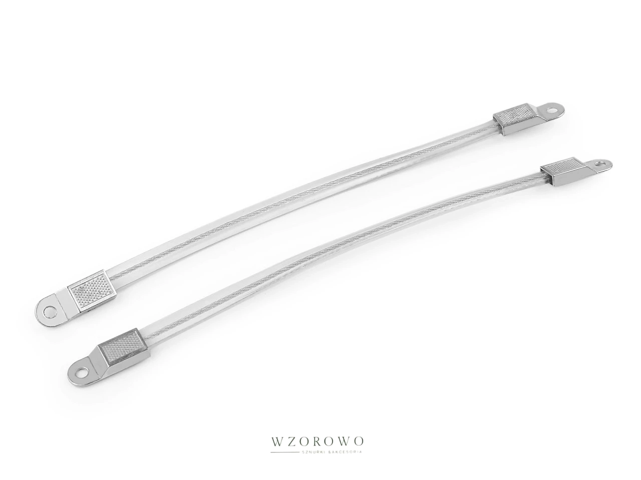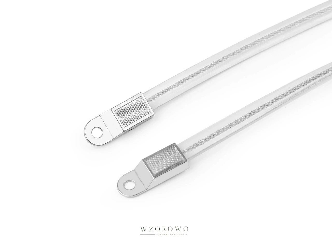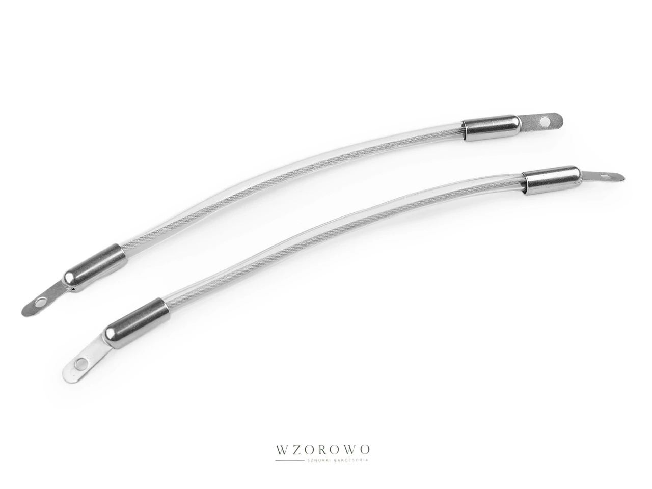 Uszy do torebek lub toreb służą jako podstawa, którą możesz dostosować i ozdobić według własnego gustu (syzdełkowanie, obszycie, technika makramy itp.). Składa się z elastycznej przezroczystej osłony z PVC, w której znajduje się metalowa linka. Przymocuj je do torebki za pomocą nitów (na końcu każdego ucha znajduje się otwór Ø4 mm).